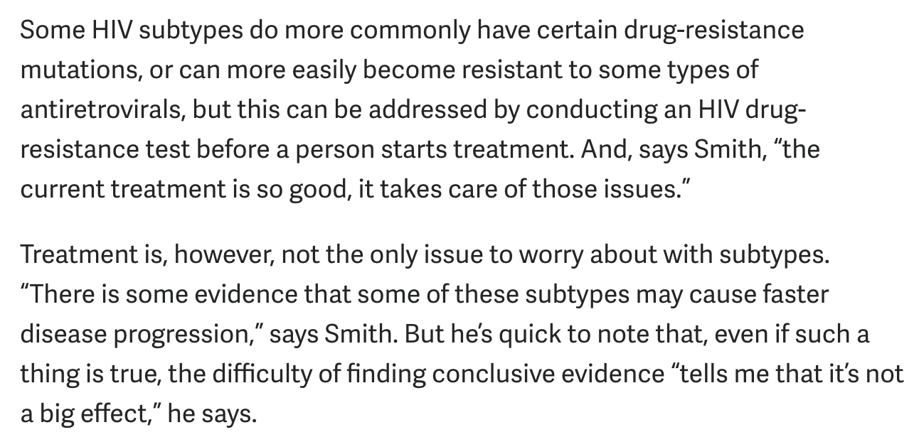 When you do your own research — and you should — here's some help. When I seek out credible information about HIV — information that I know is edited and vetted by diligent, sex-positive editors and written in language I can understand (journals for medical professionals and actual medical reports are too dense with medical jargon for me to understand) — I look to Plus and TheBody. I trust these sources because I've written for them and know their staff. In these HIV news outlets, a smattering of headlines show that there are ample doubts and inconsistencies in what we know about dual infection: "AIDS Expert Questions the Threat of HIV 'Superinfection'" in 2003, "Study Finds No Sign of Superinfection" in 2004, "Is HIV Superinfection Unhealthy?" in 2014, and, most recently, "Whatever Happened to HIV Superinfection?" in April 2020. This last one helpfully explains the reality of natural different strains of HIV (called HIV subtypes). See below: