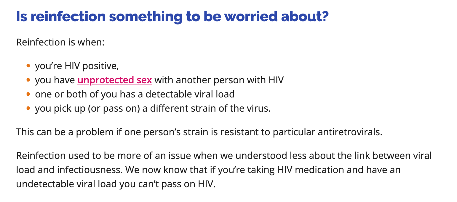 Let's move on to your fears of reinfection, dual infection, or "superinfection", which is such a ridiculous scare word that I'm tempted to roll my eyes. All of these words describe the same thing. Reinfection with a drug-resistant strain of HIV is a concern if the person fucking you can transmit HIV. If your boyfriend is undetectable, he can't. Here's a screenshot from Terrence Higgins Trust, a British HIV/AIDS charity organization: